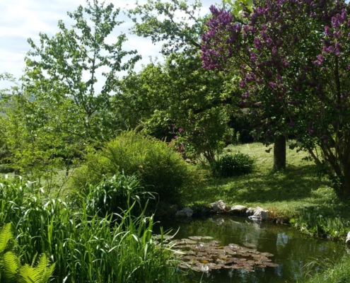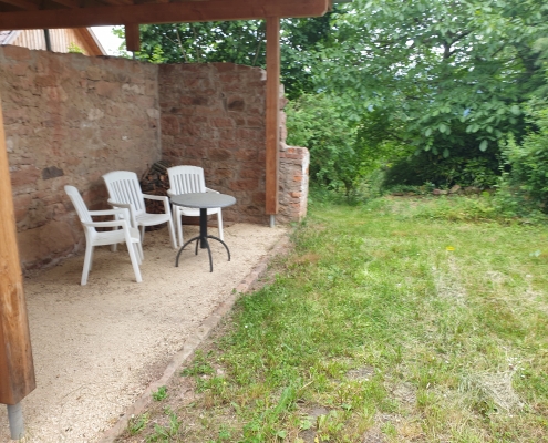 Der überdachte Sitzplatz im Garten und das Plateu unterm Walnussbaum bieten schattige und wettergeschützte Sitzgelegenheiten im Freien.